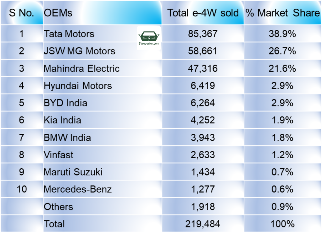 - JSW MG Motors secured second place with 26.7% market share (58,661 units), followed closely by Mahindra Electric 21.6% market share (47,316 units).