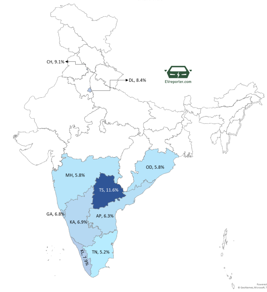 - Kerala recorded an electric car penetration of 7.9%.