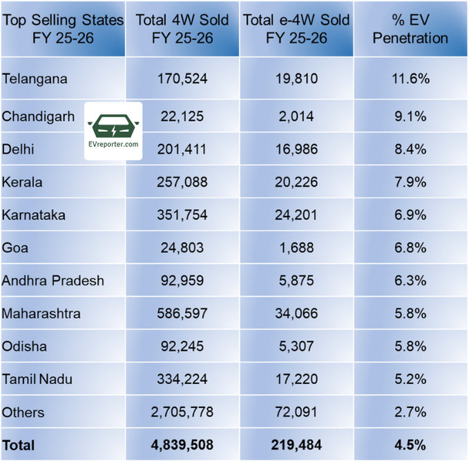 - Telangana recorded the highest share in EV penetration of 11.6% with 19,810 units e-4Ws sold (till Feb 2026), followed by Chandigarh with 9.1% (2,014 units) and Delhi with 8.4% penetration (16,986 units).