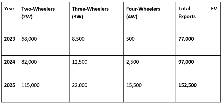 India’s rapidly growing EV ecosystem is now beginning to reflect its momentum on the global stage through rising EV exports. With approximately 75,000 EVs exported in 2023, India crossed its own benchmark by exporting over 97,000 EVs in 2024. While official figures for 2025 are yet to be released, early indicators suggest that the year will register a significant acceleration in EV exports, signalling India’s growing intent to participate in the global electric mobility supply chain.