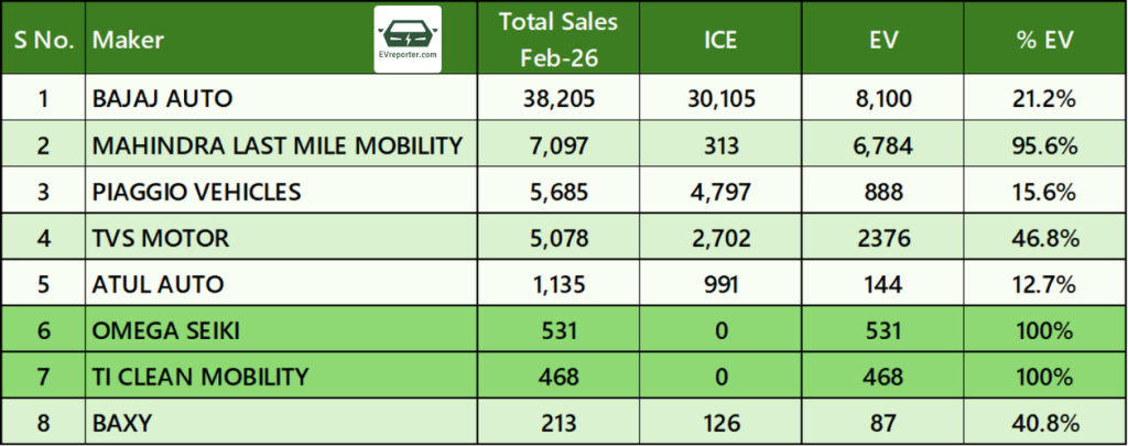 In February 2026, Bajaj Auto led the passenger three-wheeler segment with 38,205 units, of which 21.2% were EVs. Mahindra Last Mile Mobility recorded 7,097 units with a high EV penetration of 95.6%, while Piaggio Vehicles (15.6%) and TVS Motor (46.8%) also reported notable EV shares. Atul Auto posted 12.7% EV contribution, and Baxy reported 40.8% EV penetration. Pure EV players Omega Seiki and TI Clean Mobility recorded 100% EV sales.