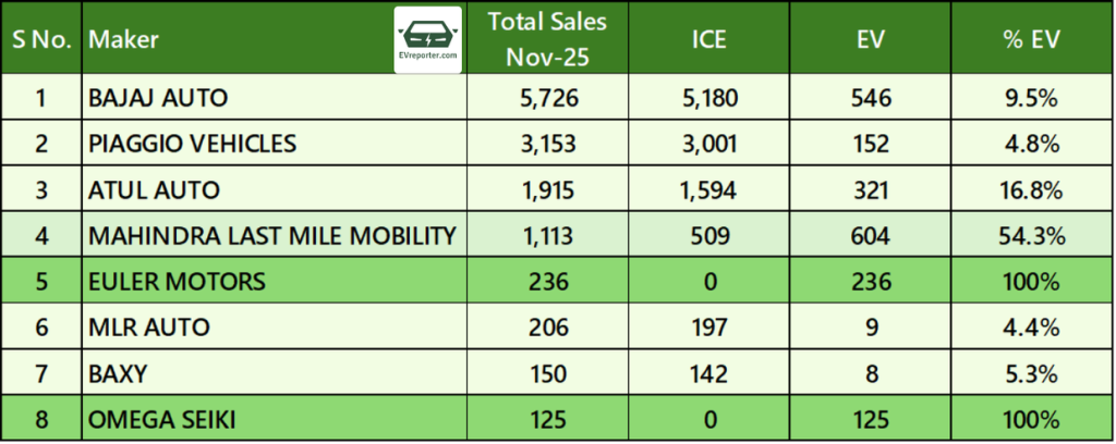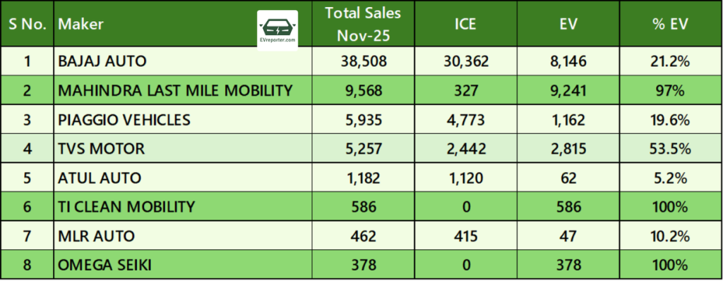 In November 2025, Bajaj Auto led the three-wheeler passenger market with total sales of 38,508 units, including 8,146 EVs (21.2%). Mahindra Last Mile Mobility followed with 9,568 units, of which 9,241 were EVs, achieving a 97% electric share. Piaggio Vehicles sold 5,935 units with 1,162 EVs (19.6%), while TVS Motor recorded 5,257 units, including 2,815 EVs (53.5%). Atul Auto posted 1,182 units with a 5.2% EV share, and MLR Auto sold 462 units with 10.2% EV penetration. Pure EV manufacturers TI Clean Mobility (586 units) and Omega Seiki (378 units) reported 100% EV sales.
