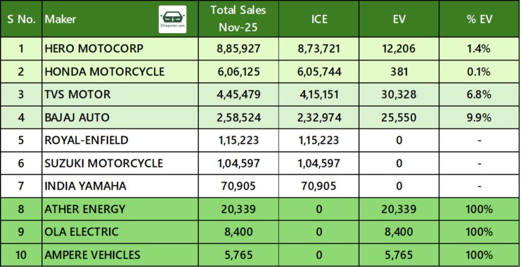 India ICE vs EV sales | For top 2W, 3W, 4W OEMs in November 2025