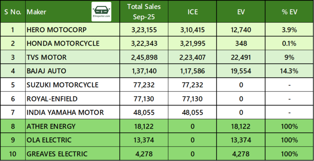 Hero MotoCorp led overall two-wheeler sales in September 2025 with 3,23,155 units, including 12,740 EVs (3.9%), followed by Honda Motorcycle with 3,22,343 units and a minimal EV share of 0.1%. TVS Motor sold 2,45,898 units with 22,491 EVs, achieving a 9% EV share, while Bajaj Auto recorded 1,37,140 units, including 19,554 EVs (14.3%), the highest among legacy OEMs. Pure-play EV makers Ather Energy (18,122 units), Ola Electric (13,374 units), and Greaves Electric (4,278 units) reported 100% EV sales. Suzuki Motorcycle, Royal Enfield, and Yamaha did not report any EV sales during the month.