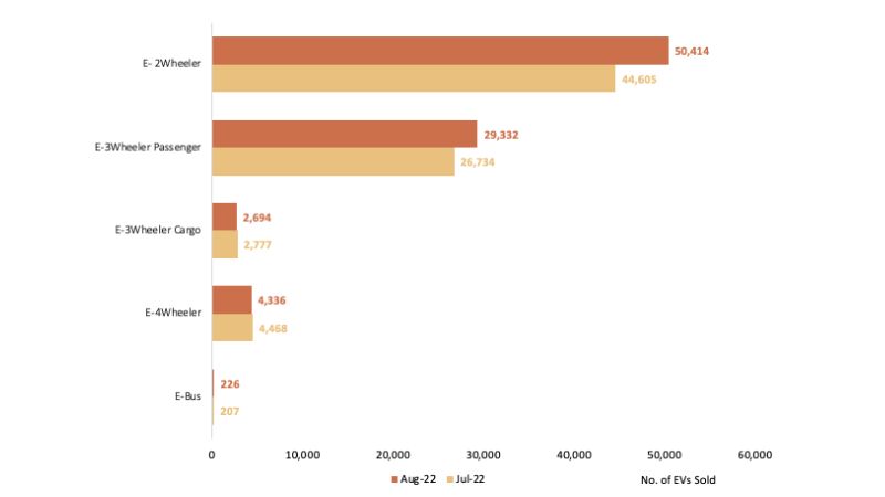 E-2W and E-3W (Cargo & Passenger) vehicles accounted for 82,440 of the total 87,038 electric vehicles sold in August 2022.