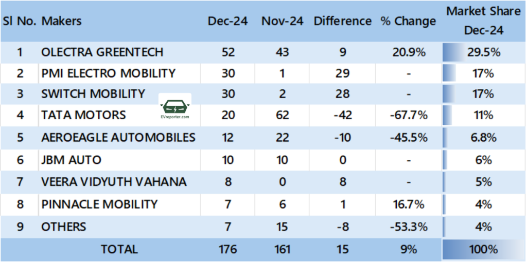 Olectra Greentech sold the most electric buses in December 2024, followed by PMI Electro Mobility and Switch Mobility.