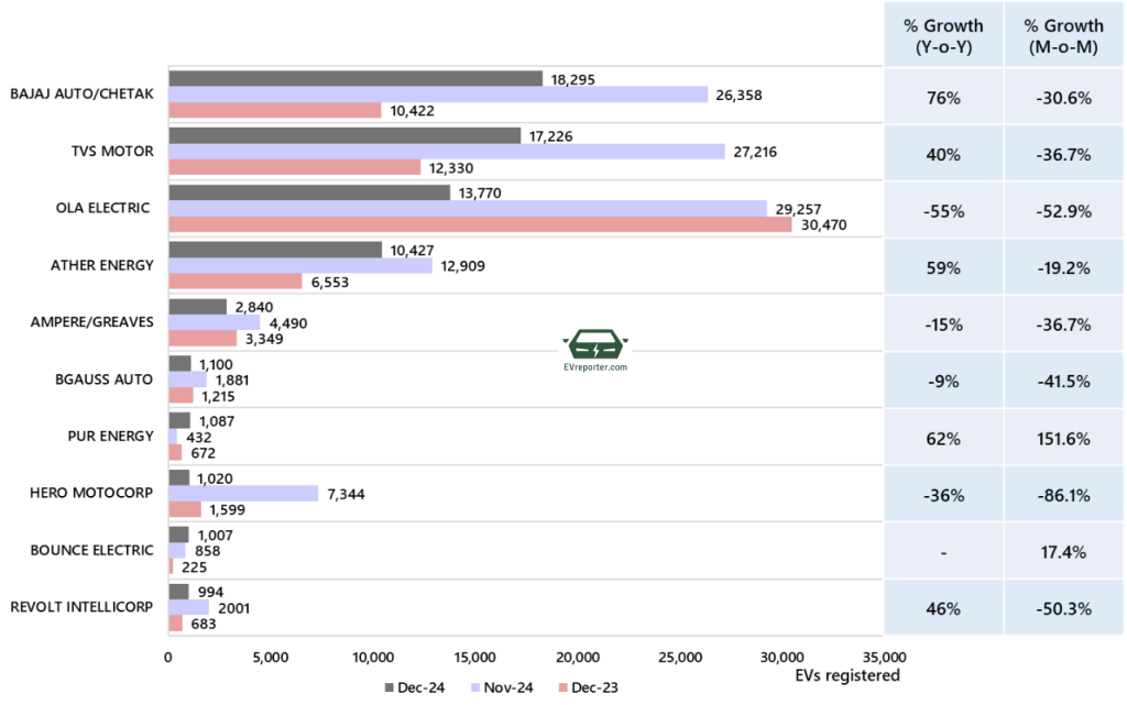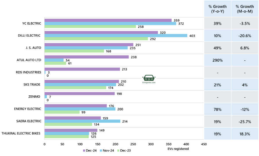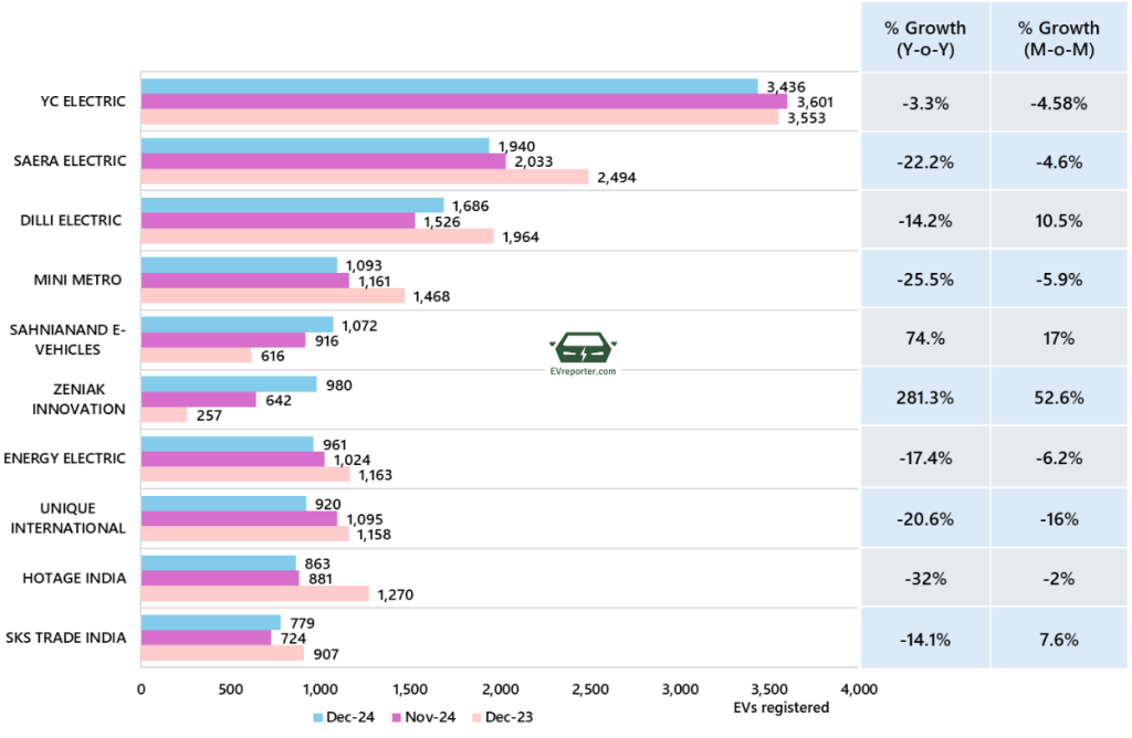 In December 2024, the e-rickshaw sales were led by YC Electric, SAERA Electric and Dilli Electric.