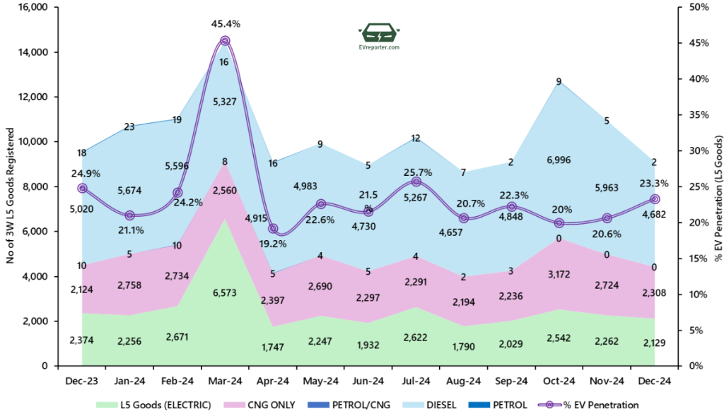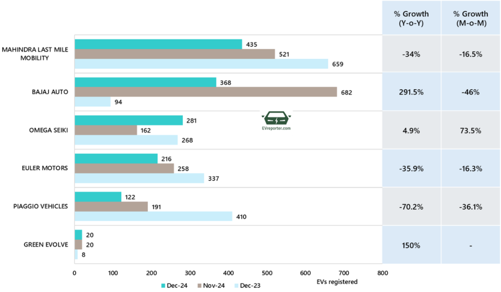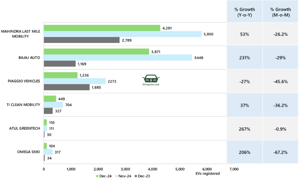 In December 2024, the electric three wheeler goods sales were led by Mahindra Last Mile Mobility, Bajaj Auto, and Omega Seiki.