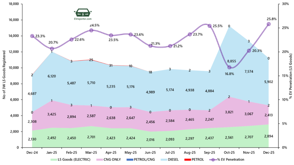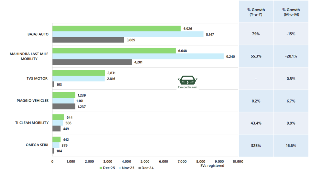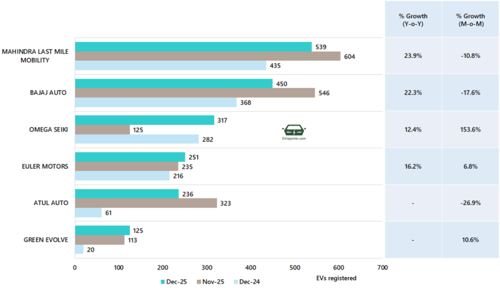 In December 2025, the electric three wheeler goods sales were led by Mahindra Last Mile Mobility, Bajaj Auto, and Omega Seiki.