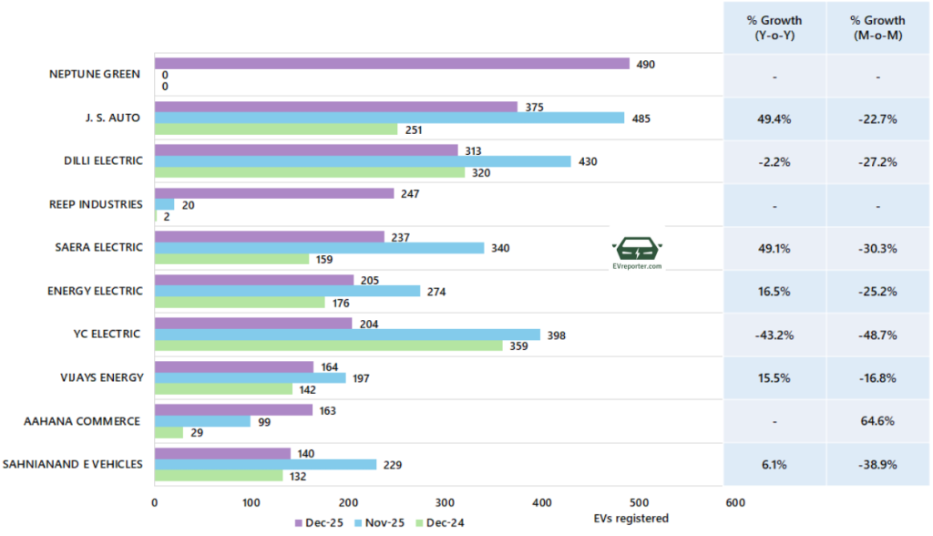 In December 2025, the e-cart sales were led by Neptune Green, followed by J.S. Auto and Dilli Electric.