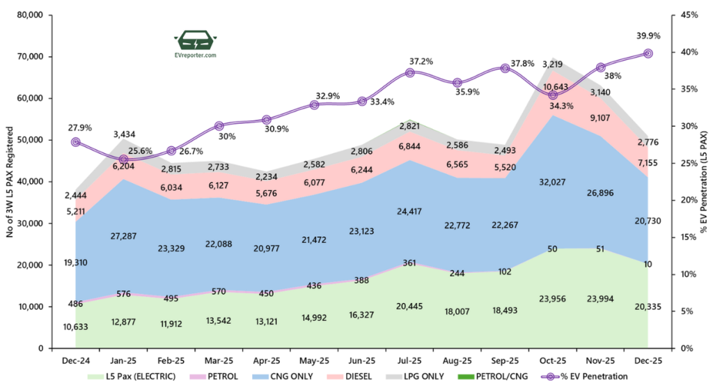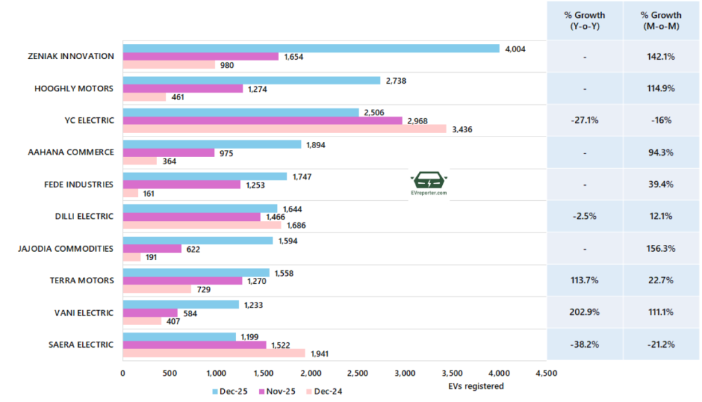 In December 2025, the e-rickshaw sales were led by Zeniak Innovation, Hooghly Motors and YC Electric.