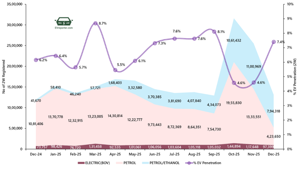 EV penetration in the two-wheeler (2W) category increased from 4.6% in Nov 2025 to 7.4% in Dec 2025.