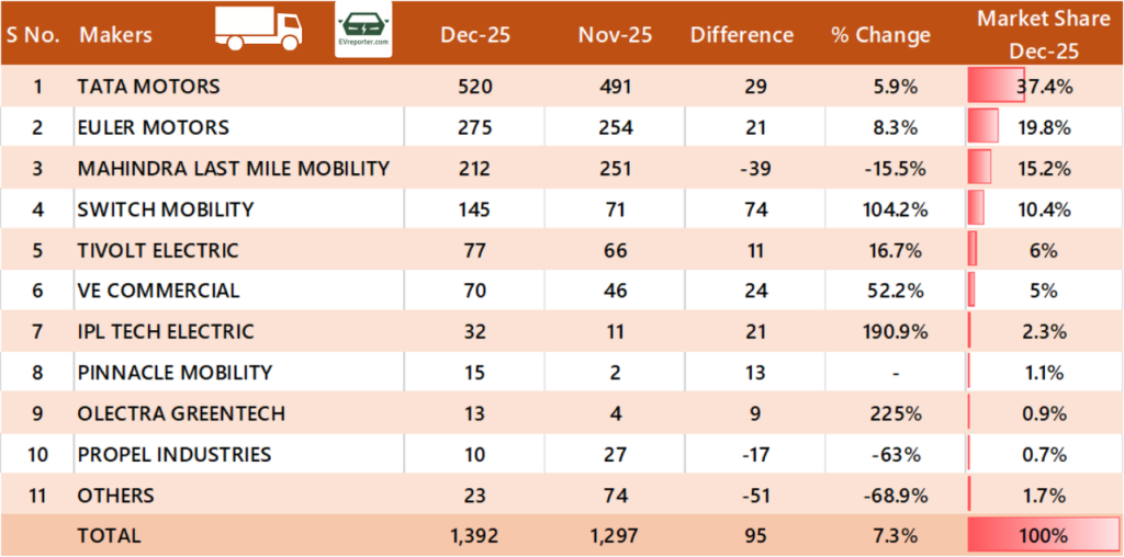 Tata Motors is the clear leader with over 37% market share in e-goods carrier sales in December 2025, followed by Euler Motors and Mahindra Last Mile Mobility.