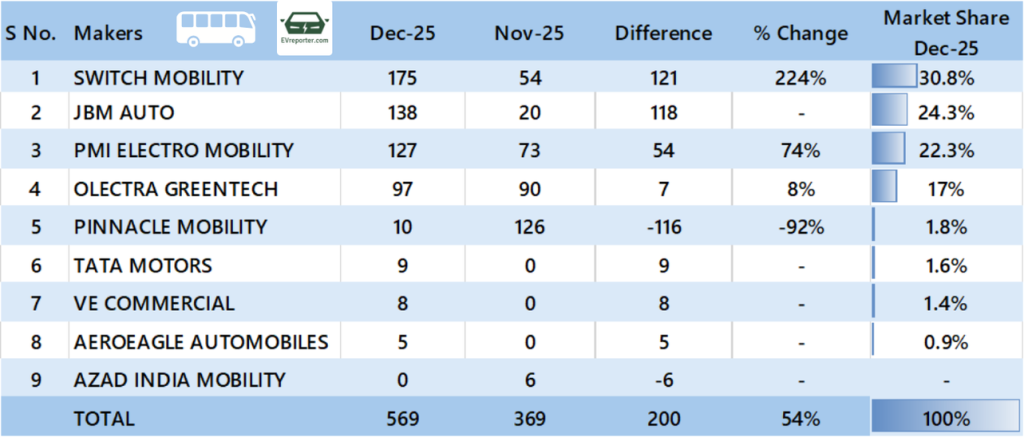 Switch Mobility sold the most electric buses in Dec 2025, followed by JBM Auto and PMI Electro Mobility.