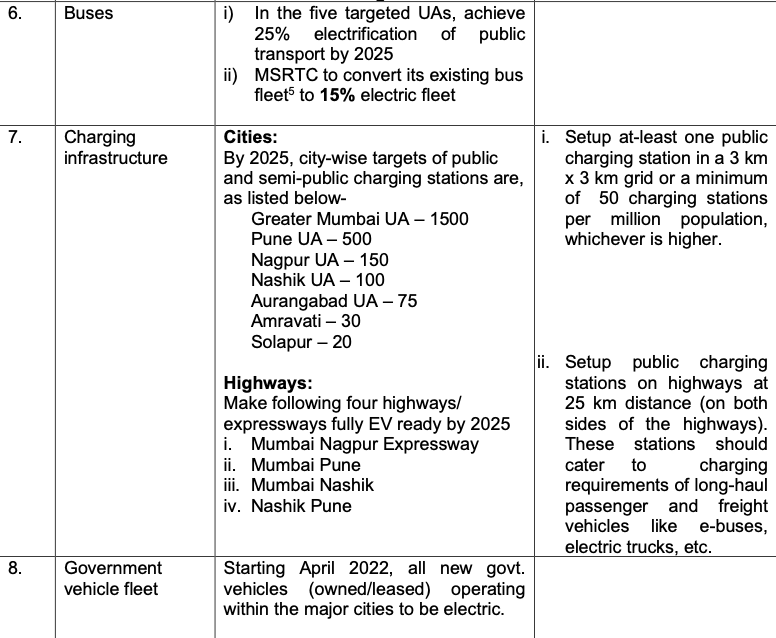 – In the five targeted urban agglomerations in the state (Greater Mumbai UA, Pune UA, Nagpur UA, Nashik UA, and Aurangabad UA), achieve 25% electrification of public transport and last-mile delivery vehicles by 2025.