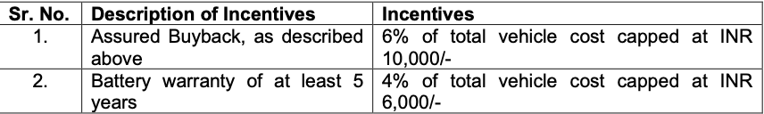 OEMs who offer buyback schemes for vehicles which are up to 5 years old at a value reduced by not more than 7.5% per year of the age will be eligible for additional incentives. An OEM can avail both the incentives simultaneously, however the total incentive amount will be limited to INR 12,000.