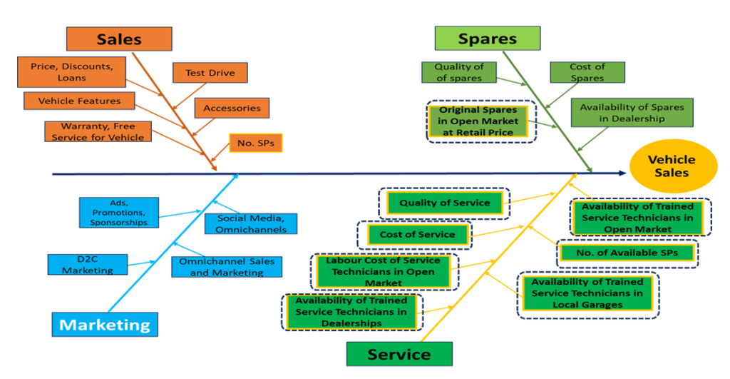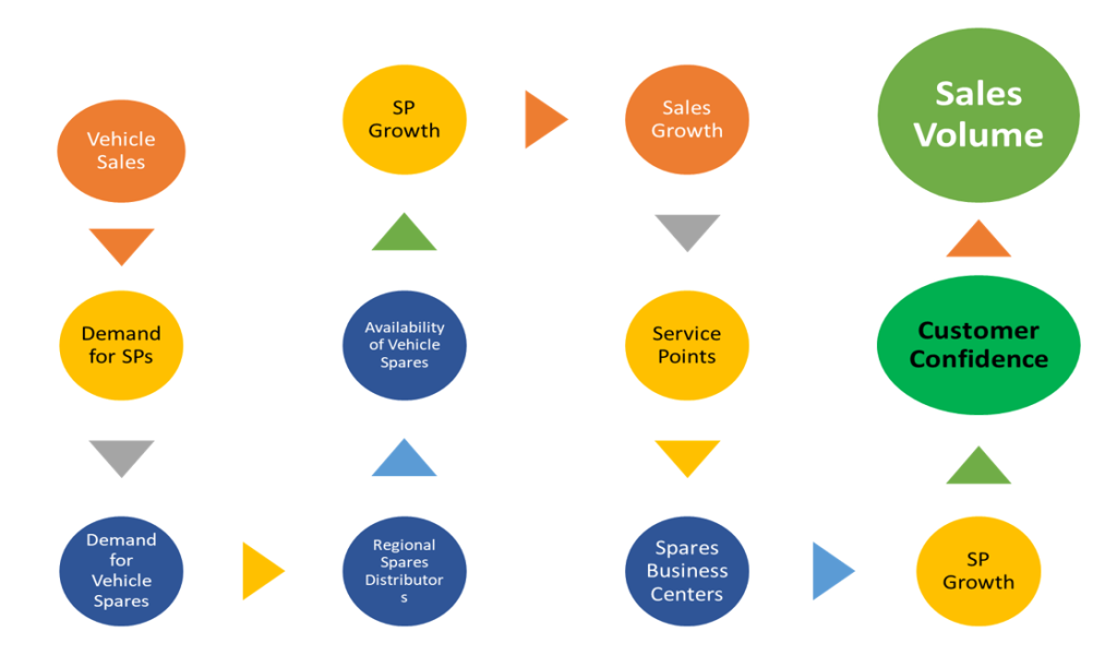But independently, the 3-S forces together form an interlocking dependence and an interlocking integrated value chain with each other that directly impacts Vehicle Sales. The de-integrated 3-S forces are Value Locked Profit Centres that operate as Free Market Forces, each driving the growth of the other. With the increase in Vehicle Sales, the need for SPs increases. With the expansion and growth of SPs, the need for Easy Availability of spares increases. In such a Business Scenario, the availability of spares had to be liberated from the control and influence of the dealers. Once this was done, spares were easily available in the open market. As a result, Garage Technicians and Local Mechanics had the confidence to respond to every vehicle that came for repair. This confidence in the mechanics was translated into the customers’ confidence in the product.