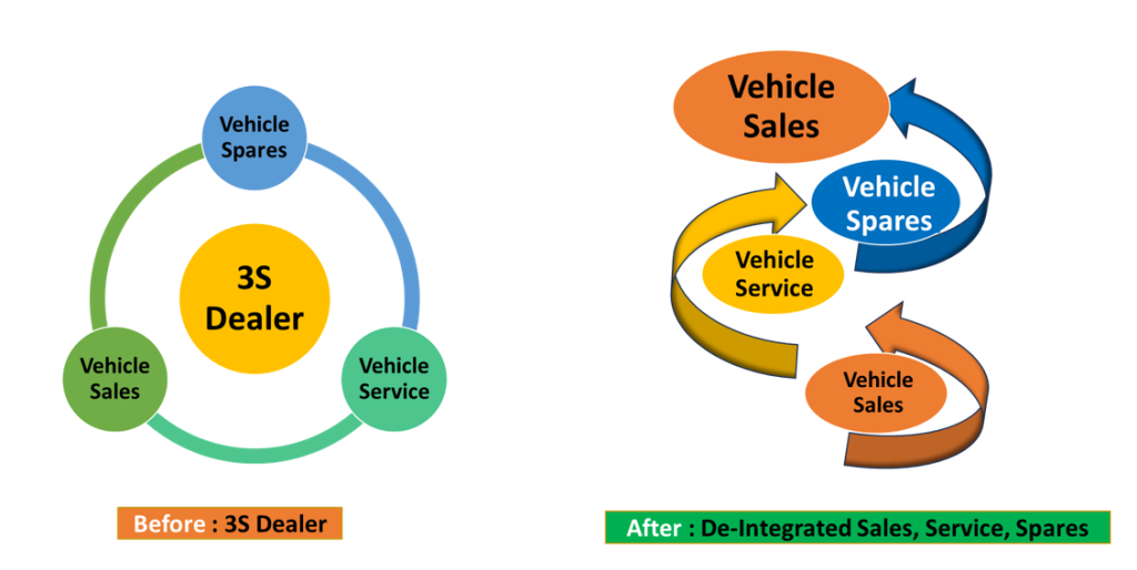 - 3S -> 1S + 1S + 1S: For a non-premium Automotive brand, the dynamics of growth lie in de-integrating Sales, Service and Spares under 3 Separate Business Roofs. And allow them to operate as Independent Market Forces.