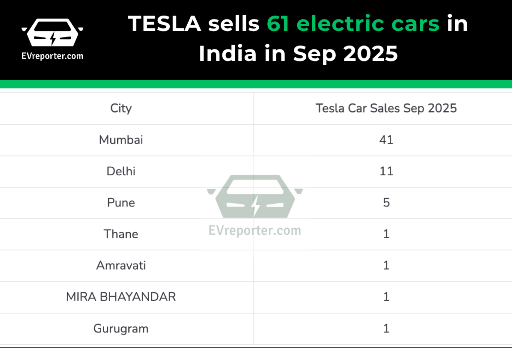 Tesla, the U.S.-based electric vehicle manufacturer, sold 61 units in Sep 2025: 41 in Mumbai, 11 in Delhi, 5 in Pune, and one each in Thane, Amravati, Mira Bhayandar, and Gurugram. These vehicles are currently being imported as CBUs and are available in select cities.