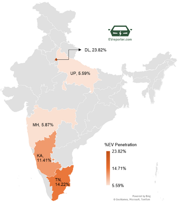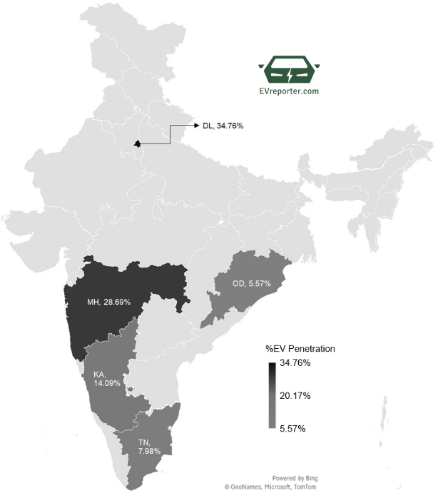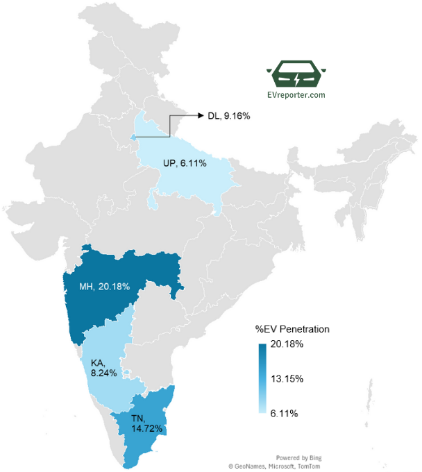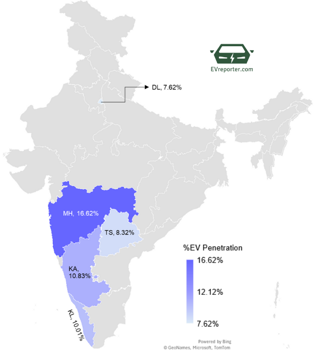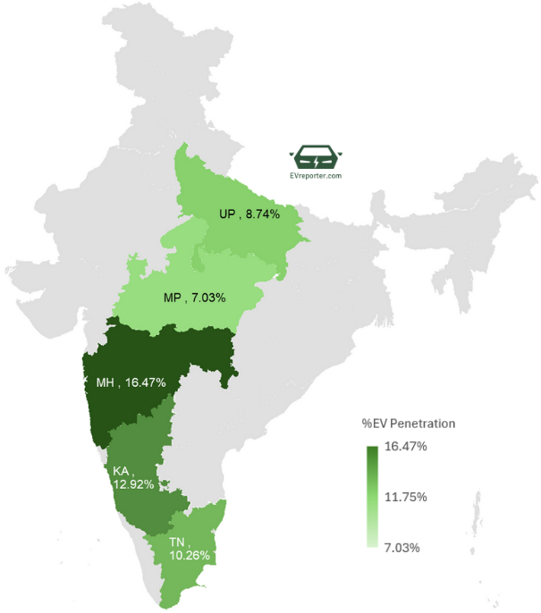 - During this period, Maharashtra recorded the highest EV penetration of 16.62% with 22,252 e-4W units sold, followed by Karnataka with 10.83% (14,495 units) and Kerala with 10.01% (13,404 units).
