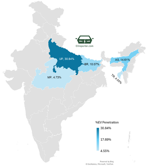 - Uttar Pradesh recorded the highest EV penetration of 30.84% with 42,704 L5M e-3Ws sold, followed by Assam with 14.61% (20,231 units) and Bihar with 10.07% (13,950 units).